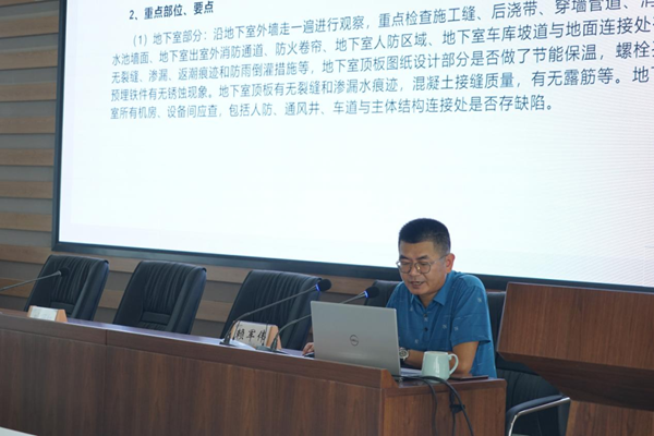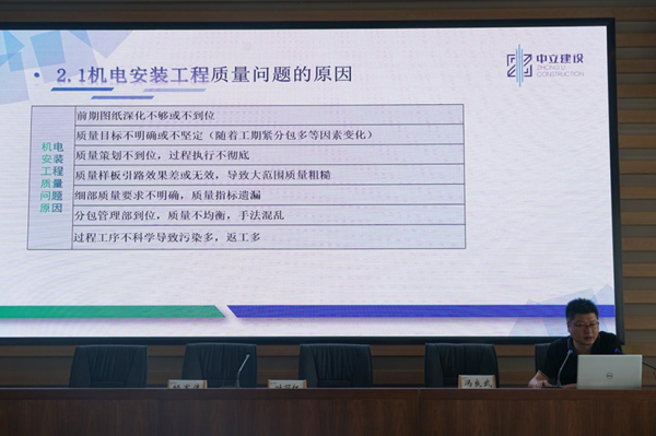 此次研討會由葉麗紅主持,技術部經理賴軍偉通過PPT展示了主體結構關注部位及核查依據,并對防水工程、混凝土工程、砌體及二次結構、屋面工程中常見質量通病進行講述。安裝總工馮良武分享了機電安裝工程的通病問題以及創優策劃與實施。