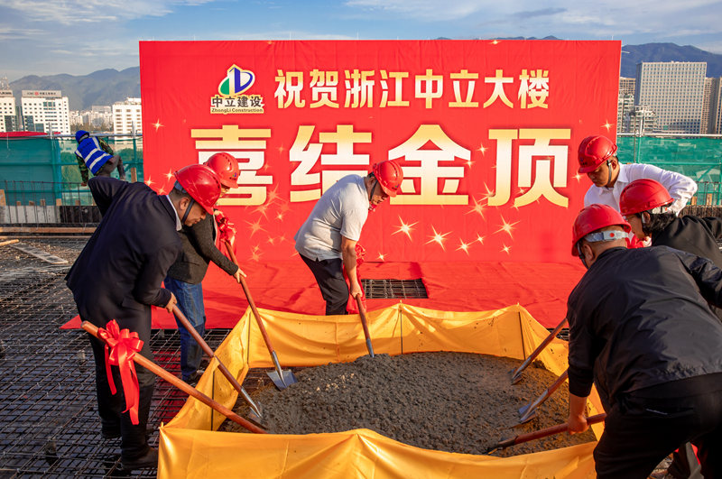 公司董事長周國強、副董事長周健、總經理鐘鳴、副總經理池甘萍、副總經理葉麗紅等人共同拿起鐵鍬,為中立大樓澆筑結頂,迎來了歷史性的時刻。